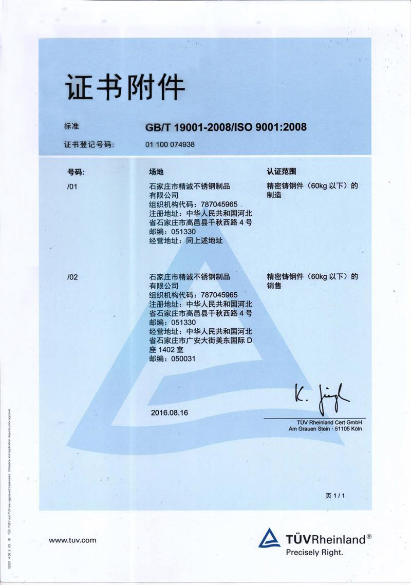 石家莊市精誠不銹鋼制品有限公司,是一家從事專業精密鑄造的企業。主要生產不銹鋼、合金鋼、低碳鋼及各種特種合金材質的精密鑄件及加工產品。